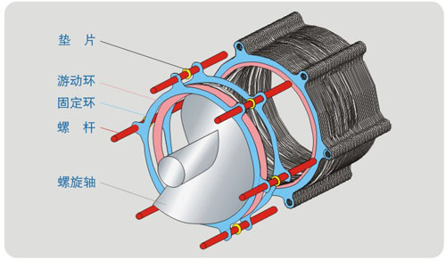 疊螺污泥脫水機(jī)的主體是由多重固定環(huán)和游動環(huán)構(gòu)成,螺旋軸貫穿其中形成的過濾裝置。前段為濃縮部,后段為脫水部,將污泥的濃縮和壓榨脫水工作在一筒內(nèi)完成,以獨(dú)特微妙的濾體模式取代了傳統(tǒng)的濾布和離心的過濾方式。